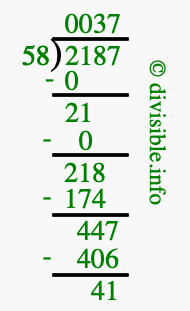 The image displays 37 at the top, which is the quotient, and 41 at the bottom, which is the remainder. Therefore, the answer to 2187 divided by 58 (2187 ÷ 58) using long division is 37 remainder 41, or simply 37 R 41.