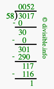 The image displays 52 at the top, which is the quotient, and 1 at the bottom, which is the remainder. Therefore, the answer to 3017 divided by 58 (3017 ÷ 58) using long division is 52 remainder 1, or simply 52 R 1.