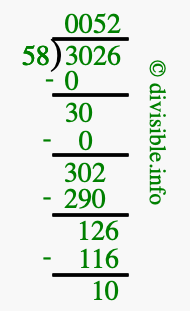The image displays 52 at the top, which is the quotient, and 10 at the bottom, which is the remainder. Therefore, the answer to 3026 divided by 58 (3026 ÷ 58) using long division is 52 remainder 10, or simply 52 R 10.