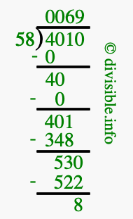 The image displays 69 at the top, which is the quotient, and 8 at the bottom, which is the remainder. Therefore, the answer to 4010 divided by 58 (4010 ÷ 58) using long division is 69 remainder 8, or simply 69 R 8.
