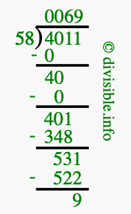The image displays 69 at the top, which is the quotient, and 9 at the bottom, which is the remainder. Therefore, the answer to 4011 divided by 58 (4011 ÷ 58) using long division is 69 remainder 9, or simply 69 R 9.