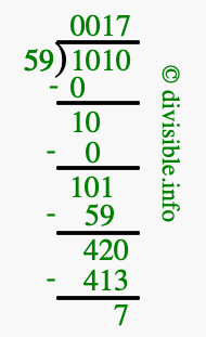The image displays 17 at the top, which is the quotient, and 7 at the bottom, which is the remainder. Therefore, the answer to 1010 divided by 59 (1010 ÷ 59) using long division is 17 remainder 7, or simply 17 R 7.