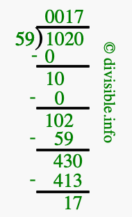 The image displays 17 at the top, which is the quotient, and 17 at the bottom, which is the remainder. Therefore, the answer to 1020 divided by 59 (1020 ÷ 59) using long division is 17 remainder 17, or simply 17 R 17.