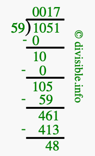 The image displays 17 at the top, which is the quotient, and 48 at the bottom, which is the remainder. Therefore, the answer to 1051 divided by 59 (1051 ÷ 59) using long division is 17 remainder 48, or simply 17 R 48.