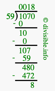 The image displays 18 at the top, which is the quotient, and 8 at the bottom, which is the remainder. Therefore, the answer to 1070 divided by 59 (1070 ÷ 59) using long division is 18 remainder 8, or simply 18 R 8.