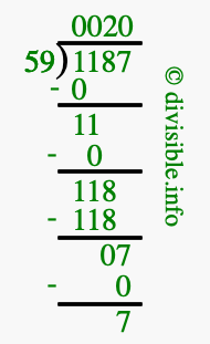 The image displays 20 at the top, which is the quotient, and 7 at the bottom, which is the remainder. Therefore, the answer to 1187 divided by 59 (1187 ÷ 59) using long division is 20 remainder 7, or simply 20 R 7.