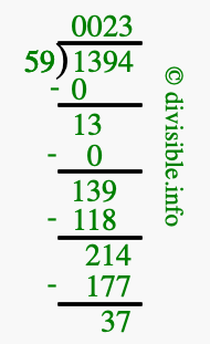 The image displays 23 at the top, which is the quotient, and 37 at the bottom, which is the remainder. Therefore, the answer to 1394 divided by 59 (1394 ÷ 59) using long division is 23 remainder 37, or simply 23 R 37.