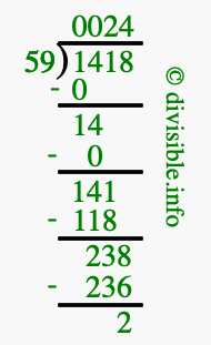 The image displays 24 at the top, which is the quotient, and 2 at the bottom, which is the remainder. Therefore, the answer to 1418 divided by 59 (1418 ÷ 59) using long division is 24 remainder 2, or simply 24 R 2.