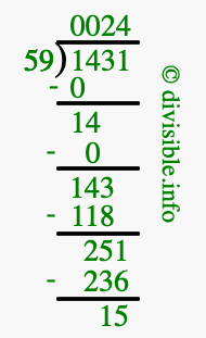 The image displays 24 at the top, which is the quotient, and 15 at the bottom, which is the remainder. Therefore, the answer to 1431 divided by 59 (1431 ÷ 59) using long division is 24 remainder 15, or simply 24 R 15.