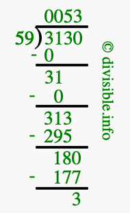 The image displays 53 at the top, which is the quotient, and 3 at the bottom, which is the remainder. Therefore, the answer to 3130 divided by 59 (3130 ÷ 59) using long division is 53 remainder 3, or simply 53 R 3.