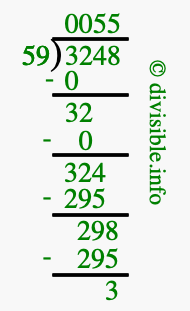 The image displays 55 at the top, which is the quotient, and 3 at the bottom, which is the remainder. Therefore, the answer to 3248 divided by 59 (3248 ÷ 59) using long division is 55 remainder 3, or simply 55 R 3.