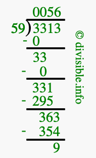 The image displays 56 at the top, which is the quotient, and 9 at the bottom, which is the remainder. Therefore, the answer to 3313 divided by 59 (3313 ÷ 59) using long division is 56 remainder 9, or simply 56 R 9.