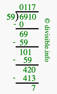 The image displays 117 at the top, which is the quotient, and 7 at the bottom, which is the remainder. Therefore, the answer to 6910 divided by 59 (6910 ÷ 59) using long division is 117 remainder 7, or simply 117 R 7.