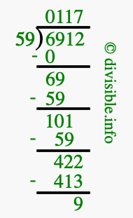 The image displays 117 at the top, which is the quotient, and 9 at the bottom, which is the remainder. Therefore, the answer to 6912 divided by 59 (6912 ÷ 59) using long division is 117 remainder 9, or simply 117 R 9.