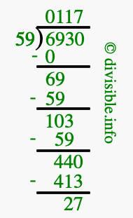 The image displays 117 at the top, which is the quotient, and 27 at the bottom, which is the remainder. Therefore, the answer to 6930 divided by 59 (6930 ÷ 59) using long division is 117 remainder 27, or simply 117 R 27.