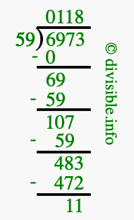 The image displays 118 at the top, which is the quotient, and 11 at the bottom, which is the remainder. Therefore, the answer to 6973 divided by 59 (6973 ÷ 59) using long division is 118 remainder 11, or simply 118 R 11.