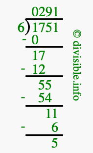 The image displays 291 at the top, which is the quotient, and 5 at the bottom, which is the remainder. Therefore, the answer to 1751 divided by 6 (1751 ÷ 6) using long division is 291 remainder 5, or simply 291 R 5.