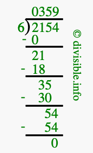 Here we will show you an image that illustrates how to calculate 2154 divided by 6 using long division. We will also give you the answer to 2154 divided by 6 (2154 ÷ 6) as a fraction and as a decimal.