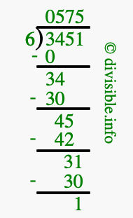 The image displays 575 at the top, which is the quotient, and 1 at the bottom, which is the remainder. Therefore, the answer to 3451 divided by 6 (3451 ÷ 6) using long division is 575 remainder 1, or simply 575 R 1.
