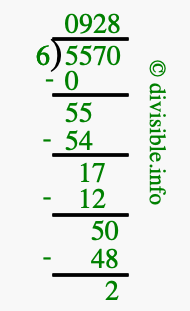 Here we will show you an image that illustrates how to calculate 5570 divided by 6 using long division. We will also give you the answer to 5570 divided by 6 (5570 ÷ 6) as a fraction and as a decimal.
