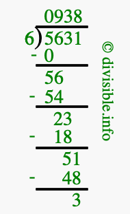 Here we will show you an image that illustrates how to calculate 5631 divided by 6 using long division. We will also give you the answer to 5631 divided by 6 (5631 ÷ 6) as a fraction and as a decimal.