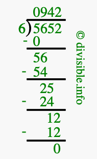 Here we will show you an image that illustrates how to calculate 5652 divided by 6 using long division. We will also give you the answer to 5652 divided by 6 (5652 ÷ 6) as a fraction and as a decimal.