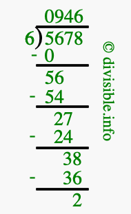The image displays 946 at the top, which is the quotient, and 2 at the bottom, which is the remainder. Therefore, the answer to 5678 divided by 6 (5678 ÷ 6) using long division is 946 remainder 2, or simply 946 R 2.