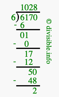 Here we will show you an image that illustrates how to calculate 6170 divided by 6 using long division. We will also give you the answer to 6170 divided by 6 (6170 ÷ 6) as a fraction and as a decimal.