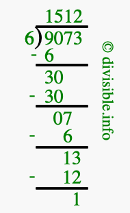 The image displays 1512 at the top, which is the quotient, and 1 at the bottom, which is the remainder. Therefore, the answer to 9073 divided by 6 (9073 ÷ 6) using long division is 1512 remainder 1, or simply 1512 R 1.