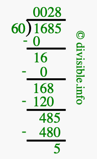 The image displays 28 at the top, which is the quotient, and 5 at the bottom, which is the remainder. Therefore, the answer to 1685 divided by 60 (1685 ÷ 60) using long division is 28 remainder 5, or simply 28 R 5.
