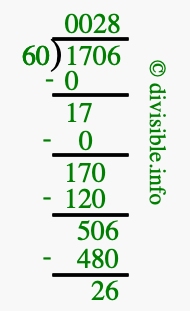 The image displays 28 at the top, which is the quotient, and 26 at the bottom, which is the remainder. Therefore, the answer to 1706 divided by 60 (1706 ÷ 60) using long division is 28 remainder 26, or simply 28 R 26.