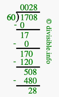 The image displays 28 at the top, which is the quotient, and 28 at the bottom, which is the remainder. Therefore, the answer to 1708 divided by 60 (1708 ÷ 60) using long division is 28 remainder 28, or simply 28 R 28.