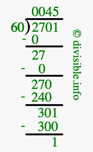 The image displays 45 at the top, which is the quotient, and 1 at the bottom, which is the remainder. Therefore, the answer to 2701 divided by 60 (2701 ÷ 60) using long division is 45 remainder 1, or simply 45 R 1.