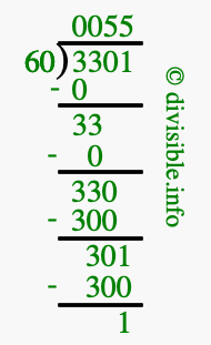 The image displays 55 at the top, which is the quotient, and 1 at the bottom, which is the remainder. Therefore, the answer to 3301 divided by 60 (3301 ÷ 60) using long division is 55 remainder 1, or simply 55 R 1.