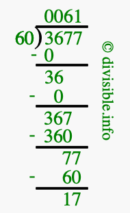 The image displays 61 at the top, which is the quotient, and 17 at the bottom, which is the remainder. Therefore, the answer to 3677 divided by 60 (3677 ÷ 60) using long division is 61 remainder 17, or simply 61 R 17.