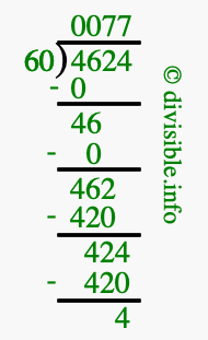 The image displays 77 at the top, which is the quotient, and 4 at the bottom, which is the remainder. Therefore, the answer to 4624 divided by 60 (4624 ÷ 60) using long division is 77 remainder 4, or simply 77 R 4.