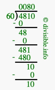 Here we will show you an image that illustrates how to calculate 4810 divided by 60 using long division. We will also give you the answer to 4810 divided by 60 (4810 ÷ 60) as a fraction and as a decimal.