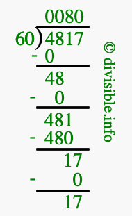 The image displays 80 at the top, which is the quotient, and 17 at the bottom, which is the remainder. Therefore, the answer to 4817 divided by 60 (4817 ÷ 60) using long division is 80 remainder 17, or simply 80 R 17.