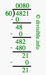 Here we will show you an image that illustrates how to calculate 4821 divided by 60 using long division. We will also give you the answer to 4821 divided by 60 (4821 ÷ 60) as a fraction and as a decimal.