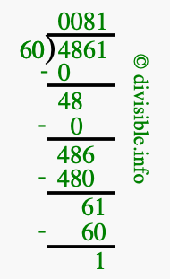 The image displays 81 at the top, which is the quotient, and 1 at the bottom, which is the remainder. Therefore, the answer to 4861 divided by 60 (4861 ÷ 60) using long division is 81 remainder 1, or simply 81 R 1.