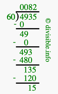 The image displays 82 at the top, which is the quotient, and 15 at the bottom, which is the remainder. Therefore, the answer to 4935 divided by 60 (4935 ÷ 60) using long division is 82 remainder 15, or simply 82 R 15.