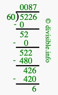 Here we will show you an image that illustrates how to calculate 5226 divided by 60 using long division. We will also give you the answer to 5226 divided by 60 (5226 ÷ 60) as a fraction and as a decimal.