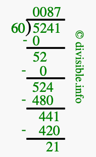 The image displays 87 at the top, which is the quotient, and 21 at the bottom, which is the remainder. Therefore, the answer to 5241 divided by 60 (5241 ÷ 60) using long division is 87 remainder 21, or simply 87 R 21.