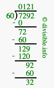 The image displays 121 at the top, which is the quotient, and 32 at the bottom, which is the remainder. Therefore, the answer to 7292 divided by 60 (7292 ÷ 60) using long division is 121 remainder 32, or simply 121 R 32.