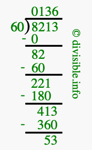 Here we will show you an image that illustrates how to calculate 8213 divided by 60 using long division. We will also give you the answer to 8213 divided by 60 (8213 ÷ 60) as a fraction and as a decimal.