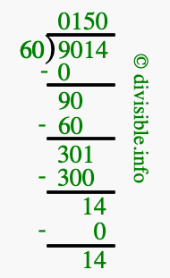 The illustration below shows you how to calculate 9014 divided by 60 using long division. As you can see, the dividend value of 9014 is located to the right of the "⟌" and the divisor value of 60 is located to the left of the "⟌".