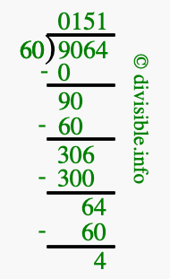 Here we will show you an image that illustrates how to calculate 9064 divided by 60 using long division. We will also give you the answer to 9064 divided by 60 (9064 ÷ 60) as a fraction and as a decimal.