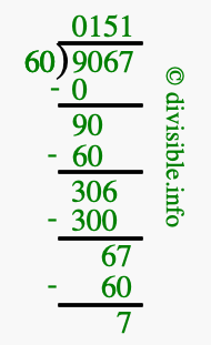 The image displays 151 at the top, which is the quotient, and 7 at the bottom, which is the remainder. Therefore, the answer to 9067 divided by 60 (9067 ÷ 60) using long division is 151 remainder 7, or simply 151 R 7.