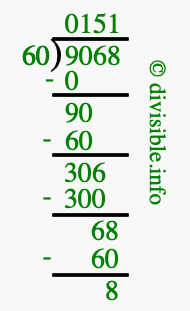 The illustration below shows you how to calculate 9068 divided by 60 using long division. As you can see, the dividend value of 9068 is located to the right of the "⟌" and the divisor value of 60 is located to the left of the "⟌".