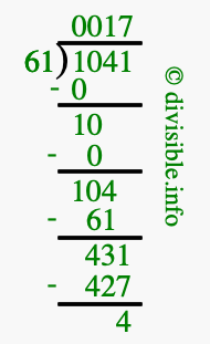 The image displays 17 at the top, which is the quotient, and 4 at the bottom, which is the remainder. Therefore, the answer to 1041 divided by 61 (1041 ÷ 61) using long division is 17 remainder 4, or simply 17 R 4.